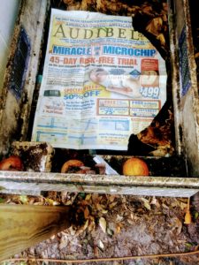 After successfully covering the side air panels with fine mush covers to keep out bugs (especially roaches in Florida), line the bottom of the toolbox with a few layered sheets of newspaper, and a few handfuls of hay sprinkled in. This will provide a good base to keep your compost soil in but allow excess moisture to drain out. As an additional key component to our soil base here, we are utilizing used coffee grounds inside of non-bleached coffee filters (because you *do not want* chemicals in your otherwise “organic” mixture; coffee filters become white from recycled paper via a toxic bleaching process). Rip apart each coffee filter into shreds that are about 1-inch apart. This will make the composting process easier for breakdown.