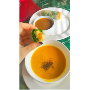 Lotus boasts a 4.6 star review according to Google reviews, and offers a colorful menu 7 days a week with lunch and dinner hours. Being allergic to wheat, I opted to start with the Golden Soup (“red lentils, onion, carrot, curry paste, celery, sweet potato, coconut milk, almond milk, mushroom seasoning”) and spring roll appetizers, surprisingly flavorful and comprised of “carrot, jicama, romaine salad, basil, rice paper, tofu, dipping in peanut sauce” (as borrowed from their online menu).